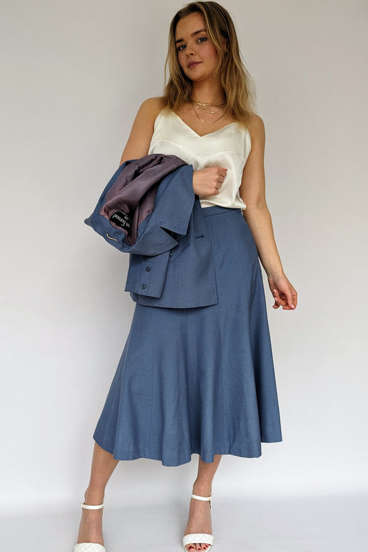 1960s Louis Feraud Dusty Blue Two Piece Skirt Suit