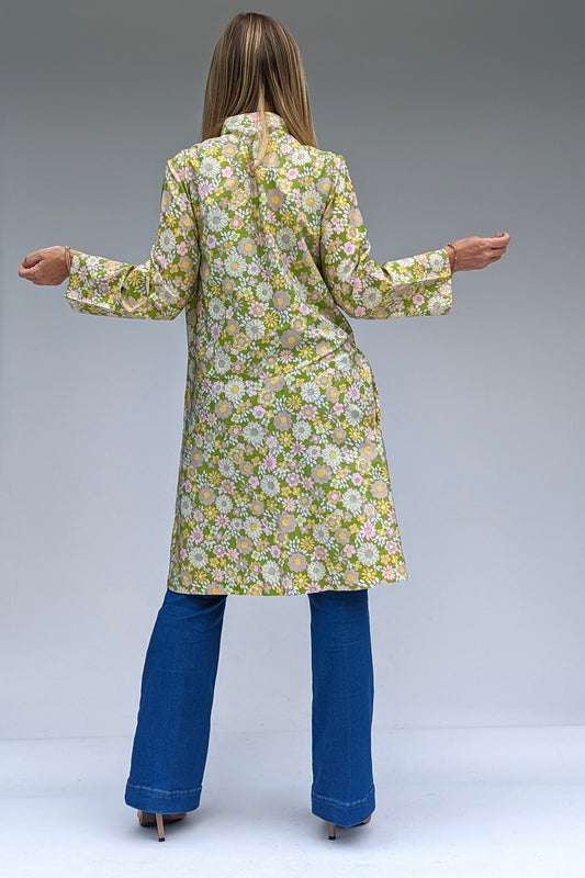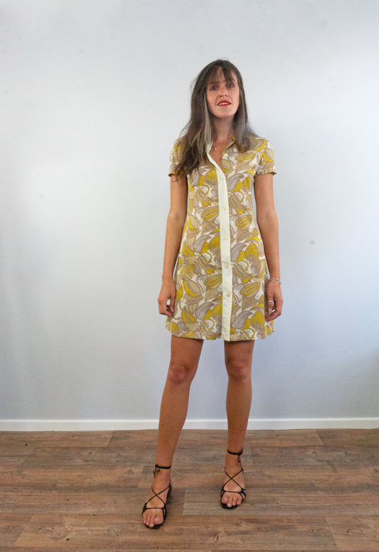 Vintage 60s Yellow Foliage Print Shirt Dress