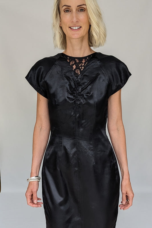 Fitted Black Vintage Soft Satin Dress with Lace Detail