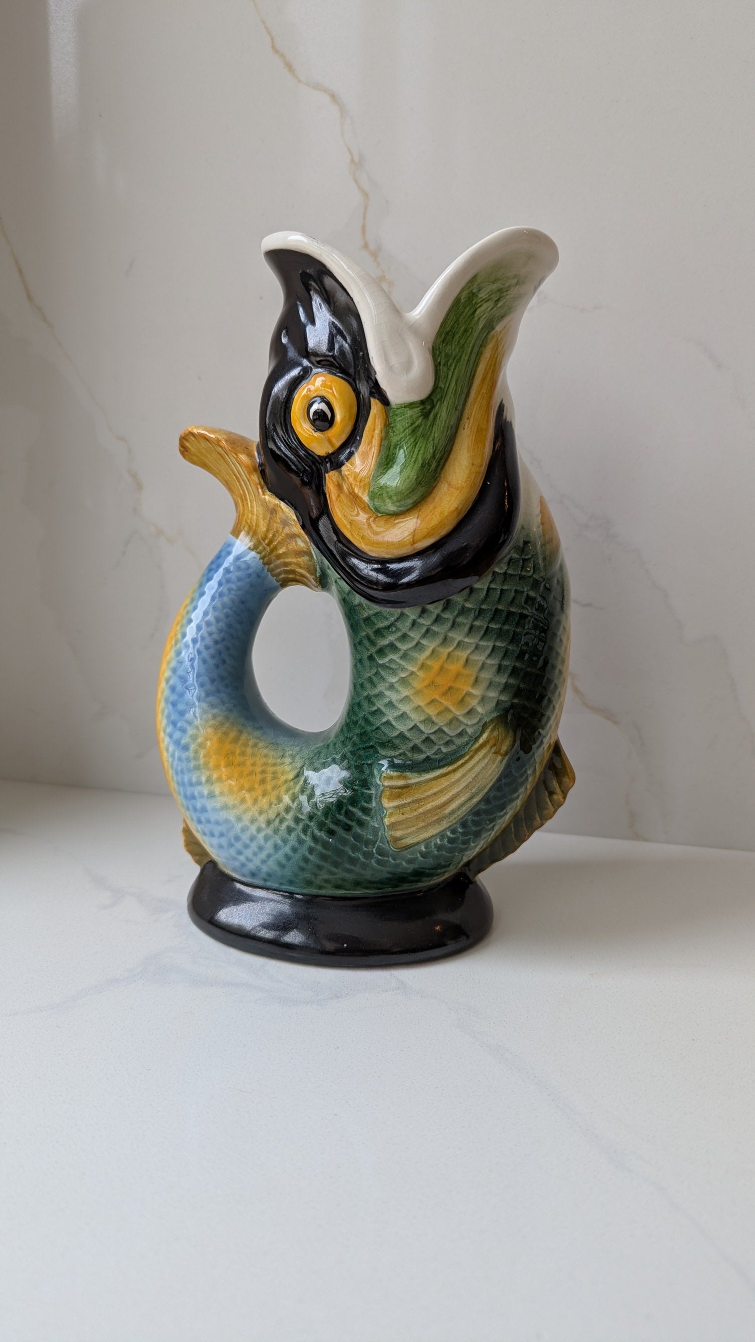 - A rare find! Originally called ‘Gluggle’ because of its characteristic ‘glug glug’ sound when poured, these jugs were first made in Staffordshire in the 1870s. Thomas Forester & Sons designed the unusual fish shape along with other unique designs in pottery and vases, which became popular household items. This special find is a Royal Winton jug who started to make them in the 1930s. The beautifully painted retro colours make it unusual compared to the newer versions of the jug. A real statement and discussion piece when visitors notice the jug in a kitchen!